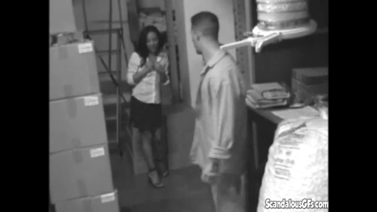 Hot sexy babe with natural tits sucking big cock and fucking her wet pussy hard in hidden stock room action
