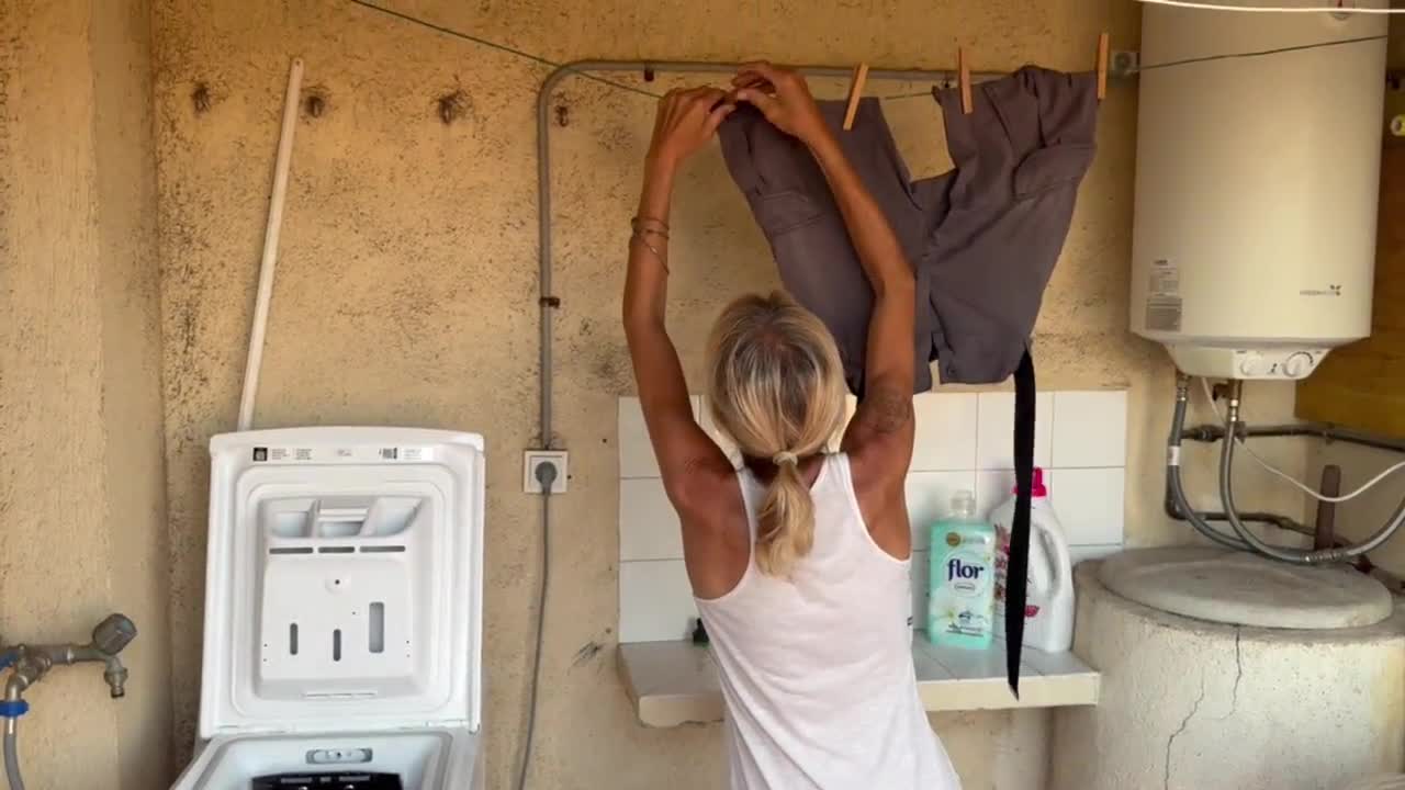 Washing machine shakes as neighbor fucks milf to two quick creampies