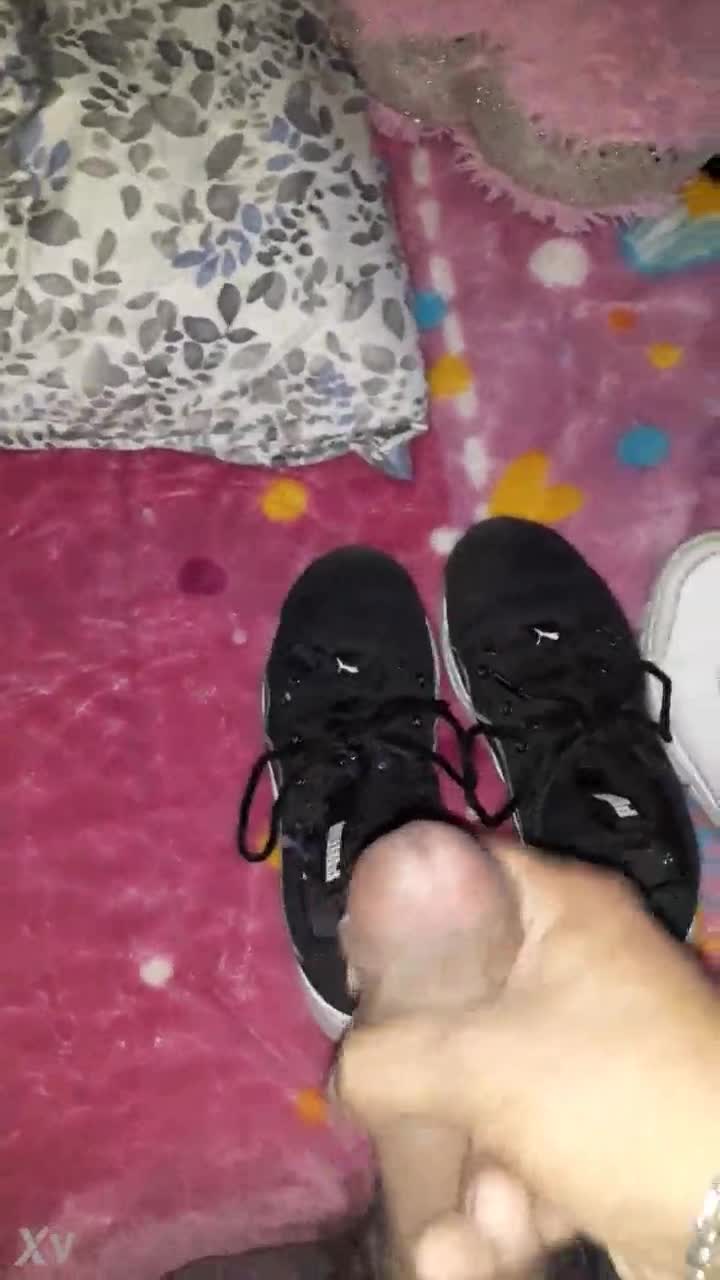 Bold cumshot blasts all over her sexy fetish feet
