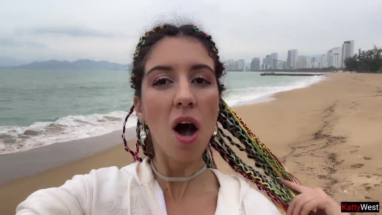 horny teen in bikini oils up for titjob then deepthroats my monster cock on beach